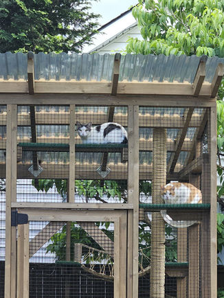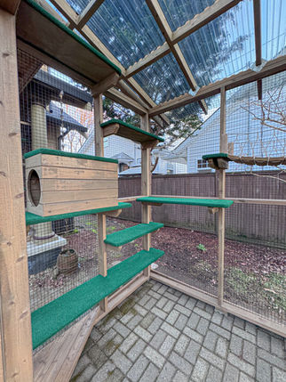 Features: This custom catio was built in the heart of Portland, Oregon for five beautiful cats who recently moved here from Hawaii. It features two connected enclosures joined by an elevated cat tunnel, giving the cats multiple spaces to lounge, explore, and safely enjoy the outdoors.