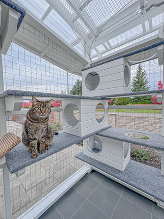 We really pushed our creativity to the next level with this project, designing and handcrafting custom accessories to maximize enrichment and fun. The honeycomb wall and stacked boxes act like a playful maze, with multiple entry points and covered fronts that give the cats both a challenge and cozy spaces to lounge. The two large cat nets serve as second levels for running or napping, while the cat tunnel that wraps around the catio creates an adventurous lookout spot with endless opportunities to explore.