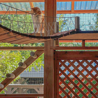It includes a bubble dome bed, a cozy hiding box, steps, and a tall scratching post for climbing and exercise. We also built a unique suspension bridge that diagonally connects the front of the catio with the side, giving the cats a fun elevated walkway.