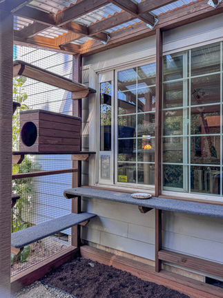 We chose this multi-catio design because, like many cats, Misty and Spooky don’t always get along. Misty can be territorial, while Spooky sometimes plays the bully. Having three separate areas, the window catio, the tunnel, and the large catio, gives them the freedom to choose their own space depending on their mood. Sometimes they share, sometimes they don’t, and that flexibility keeps the peace.